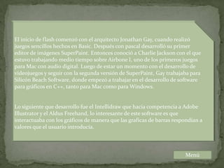 El documento resume la historia del desarrollo de Flash. Comenzó como un programa llamado Future Splash Animator creado por Jonathan Gay para crear animaciones para la web. Más tarde, la compañía Macromedia compró FutureWave Software y relanzó Future Splash Animator como Macromedia Flash 1.0, permitiendo a los diseñadores crear contenido interactivo vectorial para la web. Macromedia continuó desarrollando y mejorando Flash a través de versiones posteriores antes de que Adobe finalmente comprara Macromedia y asumiera el desarrollo de Flash.