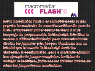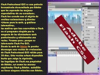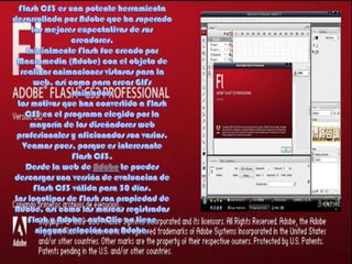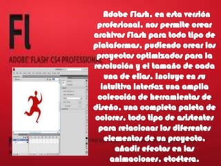 Adobe Flash Professional CS6 es un potente entorno líder para crear animaciones e interactividad que funciona en ordenadores, tablets, smartphones y televisores, permitiendo diseñar experiencias interactivas envolventes para múltiples dispositivos.