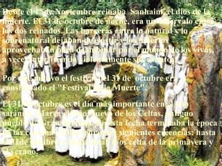 El documento describe las creencias y prácticas asociadas con el festival celta de Samhain, el cual eventualmente se convirtió en Halloween. Los celtas creían que el 31 de octubre era un día en que los espíritus podían cruzar entre el mundo de los vivos y los muertos. Celebraron el festival con sacrificios humanos llevados a cabo por los sacerdotes druidas. Más tarde, la Iglesia Católica trasladó el Día de Todos los Santos al 1 de noviembre para contrarrestar las tradiciones pag