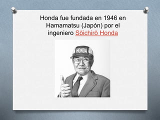 Honda fue fundada en 1946 en Hamamatsu, Japón por el ingeniero Sōichirō Honda. La compañía fabrica automóviles, motores para vehículos terrestres, acuáticos y aéreos, motocicletas, robots y componentes para la industria automotriz. Honda comenzó cuando su fundador Sōichirō Honda agregó un pequeño motor auxiliar a una bicicleta.