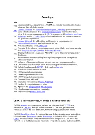 El documento proporciona una historia detallada del desarrollo de Internet desde sus inicios en la década de 1960 como una red militar estadounidense llamada ARPANET hasta su evolución en una red global de comunicaciones en la actualidad. Resume que ARPANET evolucionó para incluir universidades y luego se expandió a nivel mundial a través de conexiones en Europa y otras regiones. También destaca el desarrollo clave de protocolos como TCP/IP y la World Wide Web, que permitieron que Internet se convirtiera en la red global e interconectada que