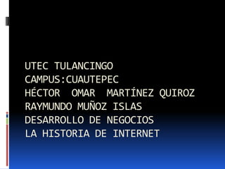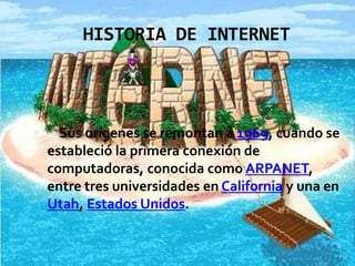El documento resume la historia de Internet. Comenzó en 1969 como ARPANET, conectando universidades en California y Utah. En 1990 se desarrolló la World Wide Web, que utiliza Internet para transmitir archivos hipertexto de forma sencilla. Además de la Web, Internet ofrece servicios como correo electrónico, transferencia de archivos y conversaciones en línea. Se ha convertido en una red descentralizada a nivel mundial gracias al protocolo TCP/IP.