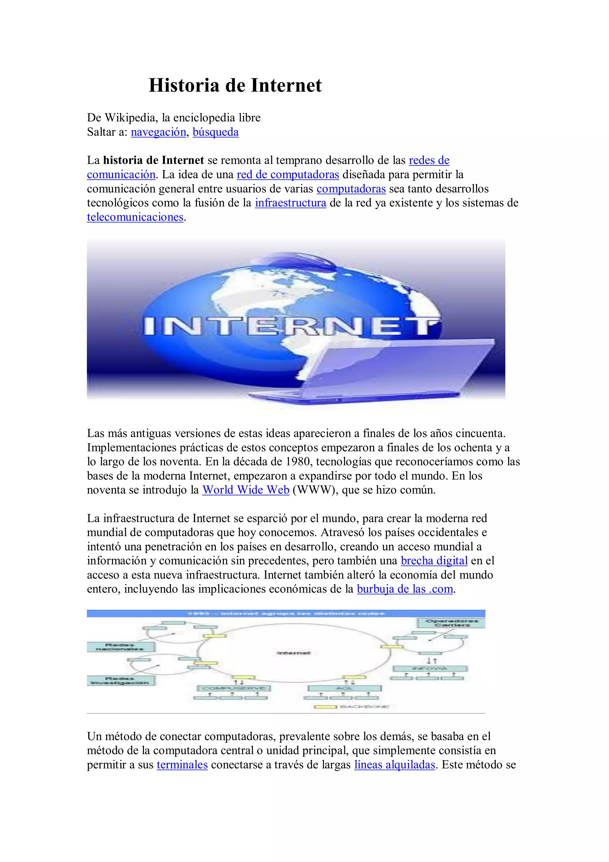 La historia de Internet se remonta a las primeras redes de comunicación entre computadoras en la década de 1960, cuando investigadores desarrollaron los conceptos de redes de paquetes y conmutación de paquetes. En 1969 se creó la red ARPANET para conectar universidades e instituciones de investigación en Estados Unidos. En los años 1980 y 1990, Internet se expandió a nivel mundial a través de protocolos como TCP/IP y la introducción de la World Wide Web en 1991, lo que permitió su popularización.
