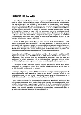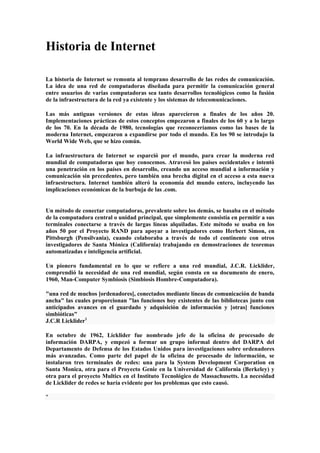 La historia de Internet se remonta a las primeras redes de comunicación entre computadoras en las décadas de 1960 y 1970. En la década de 1980 comenzaron a expandirse las tecnologías que forman la base de la Internet moderna. En la década de 1990 se introdujo la World Wide Web, que permitió el acceso mundial a la información sin precedentes pero también creó una brecha digital. El pionero J.C.R. Licklider comprendió la necesidad de una red mundial interconectada en 1960.