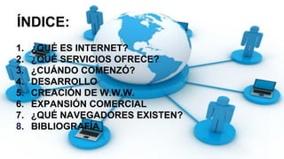 El documento resume la historia de Internet, desde sus orígenes en 1960 con la creación de ARPANET por el gobierno de EE.UU. hasta su expansión comercial en la década de 1980. Explica los principales servicios que ofrece Internet como correo electrónico, la World Wide Web y transferencia de archivos. También describe el desarrollo de tecnologías clave como TCP/IP, el cable modem, Wi-Fi y los principales navegadores web como Internet Explorer, Firefox y Chrome.