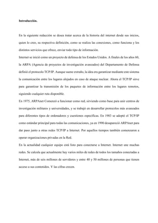 Internet se originó como un proyecto militar estadounidense en los años 1960 para garantizar la comunicación en caso de un ataque nuclear. En la actualidad, Internet une miles de redes y permite el envío de correo electrónico, la publicación de sitios web, y el acceso a información de todo el mundo. Aunque Internet ha revolucionado la comunicación y el acceso a la información, también plantea desafíos relacionados con el contenido inadecuado y las actividades ilegales.