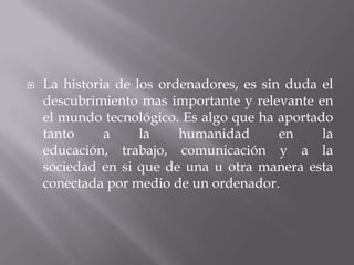 El documento resume la historia de los ordenadores, desde los primeros intentos de crear máquinas capaces de resolver ecuaciones matemáticas hasta su uso omnipresente en la actualidad. Destaca que el invento de la máquina analítica de Blaise Pascal sentó las bases para el desarrollo de los primeros ordenadores y que Howard Aiken creó el primer ordenador electrónico programable en 1939 para resolver problemas matemáticos.
