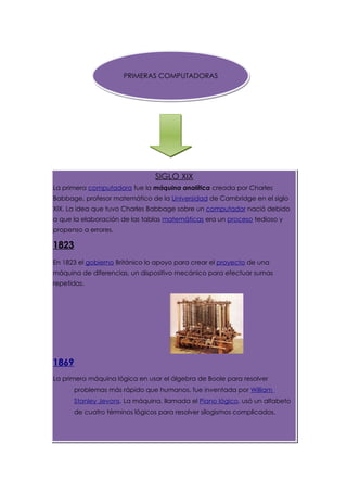 La historia de la computación comenzó con dispositivos mecánicos como el ábaco. Las primeras computadoras programables incluyeron la máquina analítica de Charles Babbage en el siglo XIX y la Z3 de Konrad Zuse en 1941. La ENIAC de 1946 fue la primera computadora electrónica digital. En las décadas siguientes, las computadoras evolucionaron desde máquinas grandes basadas en válvulas a sistemas más pequeños y rápidos basados en circuitos integrados.