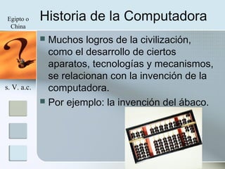 Este documento resume la historia de la computadora desde sus orígenes más antiguos como el ábaco hasta el desarrollo de las primeras computadoras electrónicas como la ENIAC, la EDVAC y el UNIVAC. Destaca los principales inventores como Charles Babbage, Ada Lovelace, Herman Hollerith y John von Neumann y sus contribuciones al desarrollo progresivo de las computadoras modernas.