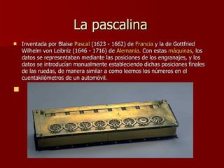 Los primeros dispositivos mecánicos para contar fueron el ábaco y las máquinas de Pascal y Leibniz, pero carecían de programas. La Mark I de 1944 fue la primera computadora programable pero usaba dispositivos electromecánicos. La ENIAC de 1947 fue la primera computadora electrónica. Finalmente, la EDVAC introdujo el concepto fundamental de von Neumann de almacenar datos e instrucciones en la misma memoria, permitiendo programar las computadoras con lenguajes en lugar de cables.