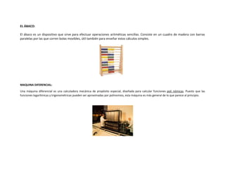 La informática estudia métodos y técnicas para almacenar, procesar y transmitir información. La computación se enfoca en el manejo del computador e identificar sus partes. Algunos hitos importantes en la historia de la computación incluyen la Pascalina, la primera calculadora mecánica inventada en 1642; el ábaco, dispositivo para realizar operaciones aritméticas simples; y la máquina tabuladora de Hollerith de 1890, una de las primeras máquinas de aplicación en informática usada para tabular el censo estad