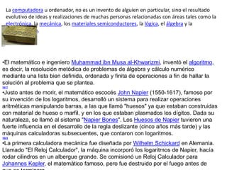 Este documento resume la evolución de la computación desde sus inicios, cuando el matemático Muhammad ibn Musa al-Khwarizmi inventó los algoritmos, hasta el desarrollo de las primeras calculadoras mecánicas por parte de inventores como Blaise Pascal, Wilhelm Schickard y Gottfried von Leibniz. El documento describe importantes hitos como la invención de los logaritmos por John Napier, la primera regla deslizante de William Oughtred y la Pascalina de Blaise Pascal, una de las primeras calculadoras mecá