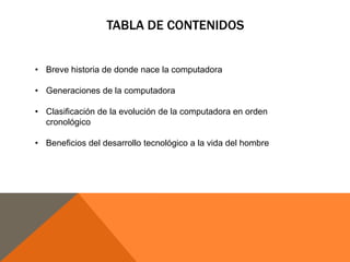 El documento resume la historia del desarrollo de la computadora desde los inicios de los sistemas matemáticos como el ábaco hasta las generaciones modernas. Explica las principales innovaciones técnicas como el transistor y el microprocesador que llevaron al surgimiento de las computadoras digitales modernas. También describe las clasificaciones de los diferentes artefactos de cómputo a través de la historia y los beneficios que el desarrollo tecnológico ha traído a la vida del hombre.