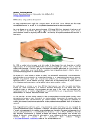 El documento describe las cinco épocas de la computación desde su inicio en el siglo XIX hasta la actualidad. Explica que la computación se encuentra actualmente en una quinta época de integración, donde las computadoras se integrarán completamente en nuestras vidas cotidianas a través de cuatro tendencias: miniaturización, centralización, reducción de costos e interfaces orgánicas. Finalmente, anticipa que la siguiente época podría ser la era de la inteligencia artificial.