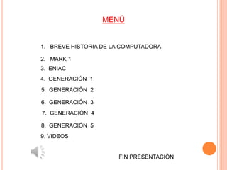 Este documento presenta un resumen de la historia de las computadoras desde los primeros dispositivos mecánicos como el ábaco y la máquina de Pascal hasta las generaciones modernas de computadoras electrónicas. Se destacan hitos como la máquina de Hollerith, el MARK I, ENIAC y el desarrollo de las cinco generaciones de computadoras desde las primeras basadas en tubos de vacío hasta las actuales de estado sólido.