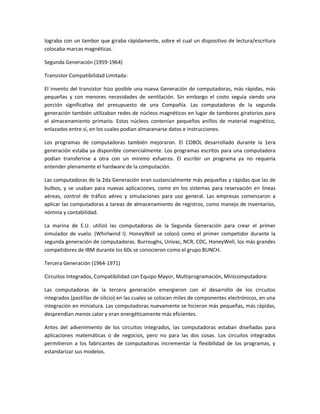 El documento resume la historia de las computadoras desde sus orígenes con dispositivos mecánicos como el ábaco hasta la sexta generación. Las primeras computadoras de la primera generación utilizaban válvulas termoiónicas y almacenamiento magnético. La llegada del transistor llevó a la segunda generación. Los circuitos integrados permitieron la tercera generación. La cuarta generación introdujo los microprocesadores. La quinta generación se centró en la inteligencia artificial. Y la sexta generación continúa avanzando hacia computador
