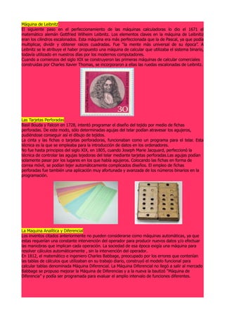 Este documento describe la historia de la computación desde sus precursores hasta las tendencias tecnológicas actuales. Comienza con los primeros dispositivos mecánicos para realizar cálculos como la Estructura de Napier y la Regla de Cálculo. Luego describe máquinas calculadoras más avanzadas como la Pascalina y la máquina de Leibnitz. Más adelante presenta el desarrollo de las tarjetas perforadas y máquinas como la Analítica y Diferencial de Babbage. Finalmente, detalla las generaciones de computador