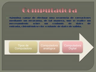 La computadora ha evolucionado rápidamente en los últimos 100 años desde su invención. Pasó de usar bulbos en la primera generación a circuitos integrados en la segunda y microprocesadores en la cuarta. Cada generación hizo que las computadoras fueran más pequeñas, rápidas y eficientes energéticamente. Hoy en día, miles de componentes electrónicos caben en un solo chip, lo que permite computadoras personales muy pequeñas con potencia similar a las primeras máquinas grandes.