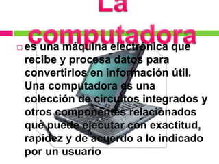 El documento describe la evolución de la computación desde dispositivos mecánicos como el ábaco hasta las computadoras modernas, resaltando hitos como la pascalina, la máquina de diferencias de Babbage y el uso de tarjetas perforadas. Se detalla la transición a computadoras más avanzadas a través de cuatro generaciones, desde bulbos hasta microprocesadores. Además, se menciona la versión de Microsoft Windows y la suite Office como ejemplos de software contemporáneo.