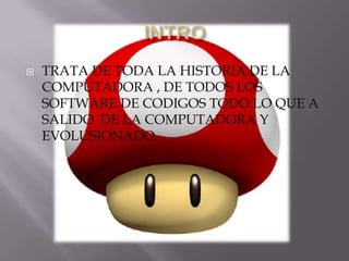 El documento resume la historia de la computadora desde sus orígenes hasta la actualidad. Comienza describiendo la primera computadora electrónica, la ENIAC, y continúa explicando conceptos como el código binario, las generaciones de computadoras, los sistemas operativos, el lenguaje HTML, periféricos e hardware. Cubre los principales hitos en el desarrollo de las computadoras e Internet a lo largo del tiempo.