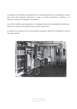 El documento describe la evolución histórica de las computadoras desde la Segunda Guerra Mundial hasta la actualidad. Señala que la guerra impulsó el desarrollo de las primeras computadoras para fines militares como la ENIAC. Luego, los avances tecnológicos como los transistores, circuitos integrados y microprocesadores permitieron computadoras más rápidas, fiables y asequibles que se expandieron a nuevos usos civiles y domésticos.