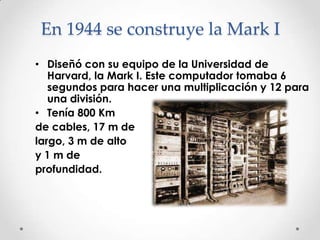 El documento resume la historia temprana de las computadoras, comenzando con la construcción de la Mark I en 1944 en la Universidad de Harvard, seguida por la ENIAC en 1947 en la Universidad de Pensilvania, que fue la primera computadora electrónica y mucho más poderosa que la Mark I. Luego, la EDVAC construida en 1949 en la Universidad de Manchester fue la primera computadora electrónica digital con capacidad de almacenamiento. Finalmente, el documento menciona el UNIVAC como la primera computadora diseñada para un propósito no militar y la Notebook