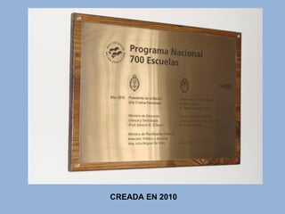 La escuela fue creada en 2010 y recibió el mobiliario en marzo de ese año. Fue inaugurada el 12 de abril de 2010 con Viviana Fardini como directora. En 2011 celebraron su primer aniversario y eligieron el nombre "Néstor Kirchner" a través de una votación de la comunidad educativa.