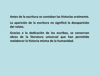 El documento resume la historia de la impresión desde los inicios de la escritura hasta la impresión moderna. Primero, las historias se contaban oralmente y luego los escribas copiaban manuscritos a mano. Más tarde, se desarrollaron el rollo y el códice para almacenar textos de forma más conveniente. Finalmente, la invención de los tipos móviles por Johannes Gutenberg permitió la impresión mecánica de libros, revolucionando la producción y distribución de conocimiento.