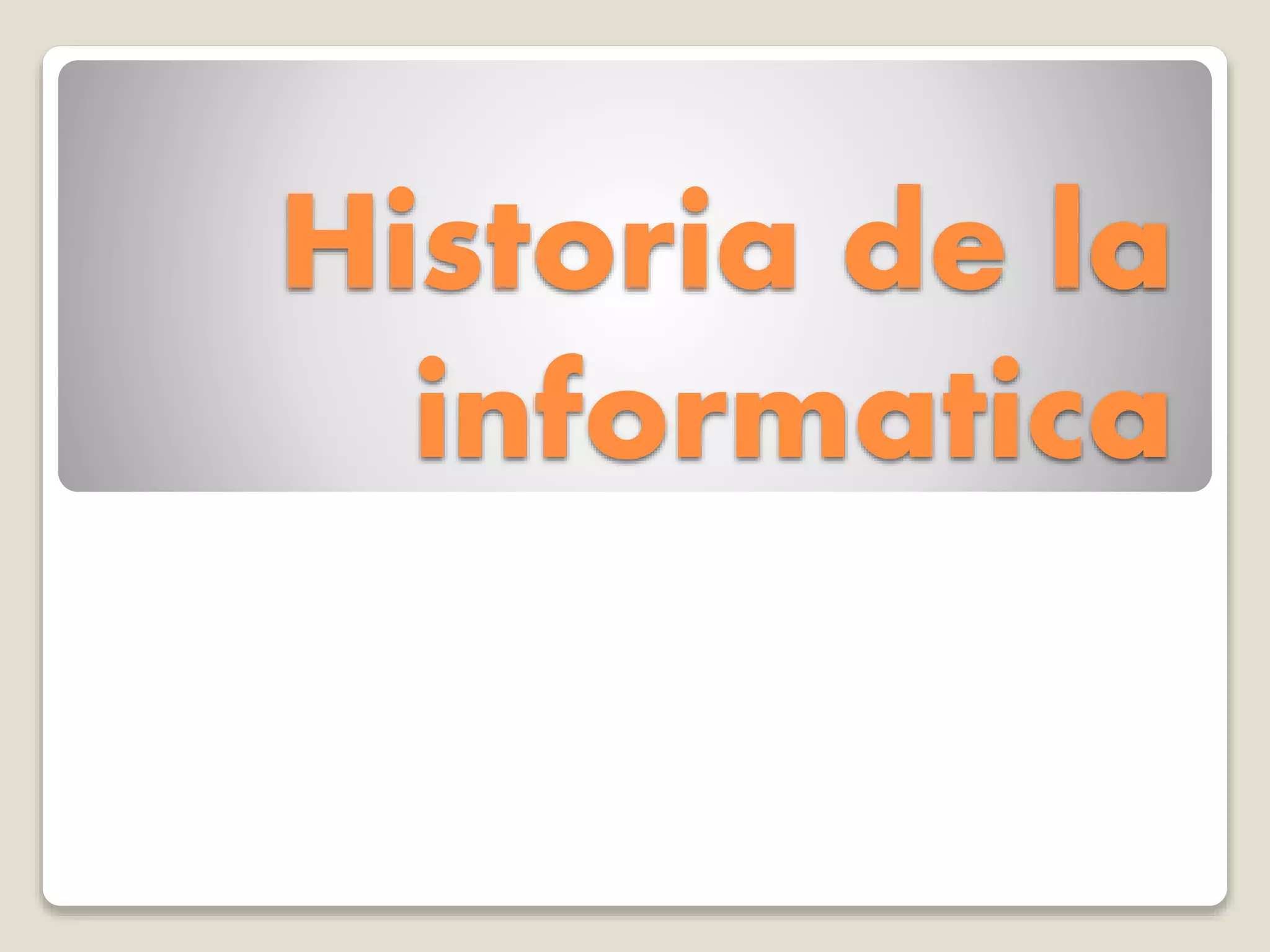 La informática estudia el tratamiento automático de la información utilizando dispositivos electrónicos y sistemas computacionales. Ha evolucionado desde el ábaco hasta los ordenadores personales modernos a través de cinco generaciones: de las máquinas basadas en válvulas hasta los circuitos integrados, el microprocesador y los ordenadores personales de los años 80.