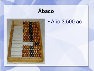 Este documento resume la historia de la computación desde el ábaco en el año 3500 a.C. hasta la tarjeta de sonido Sound Blaster en 1989. Se destacan hitos como la máquina analítica de Babbage en 1830, la máquina de Turing en 1936, la creación del lenguaje de programación en 1960, el Altair 8800 como el primer ordenador personal en 1975 y el lanzamiento de Windows 1.0 en 1985. El documento describe la evolución de la computación a través de cinco generaciones.