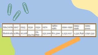 El documento detalla la evolución del sistema educativo en México desde la creación de la Secretaría de Educación Pública en 1921, destacando la transición de la educación primaria y secundaria, y la implementación de diversas reformas educativas. Incluye menciones sobre proyectos específicos como la educación técnica, rural, y socialista, que buscaban responder a las necesidades socioeconómicas del país. Además, se documenta la creación de instituciones clave, como el Instituto Politécnico Nacional en 1936, y los planes de modernización y reforma que han moldeado la educación en el país hasta la actualidad.