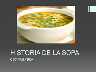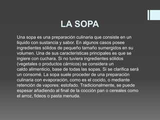 La sopa es una preparación culinaria que consiste en un líquido con sabor e ingredientes sólidos de pequeño tamaño. Tradicionalmente, la sopa constituía el plato principal en los hogares europeos y se preparaba en grandes calderos. Los caldos y sopas tuvieron su origen como una forma de ablandar alimentos duros con agua hirviendo, y con el tiempo se consumió también el agua de cocción por su sabor. La adición de diversos ingredientes dio forma a diferentes tipos de sopas como caldos, sopas espesadas,