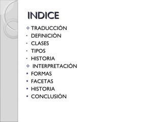 El documento aborda la traducción y la interpretación como actividades esenciales para la comunicación entre diferentes idiomas, describiendo varios tipos y formas de estas prácticas. Se presenta un recorrido histórico desde la antigüedad hasta el siglo XX, destacando su importancia para la conexión global. Se concluye que la traducción y la interpretación son clave para facilitar la comunicación, superando las barreras lingüísticas.