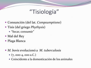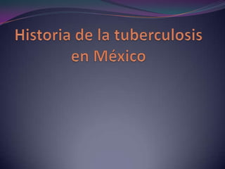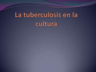 Este documento resume la historia de la tuberculosis desde sus primeras descripciones en el Antiguo Egipto y Grecia hasta los avances científicos modernos. Destaca hitos como la identificación del bacilo de la tuberculosis por Robert Koch en 1882, el desarrollo de la vacuna BCG en 1921, y el descubrimiento de antibióticos efectivos como la estreptomicina en la década de 1940. También explora cómo la tuberculosis fue representada en la literatura y el arte a través de los siglos.