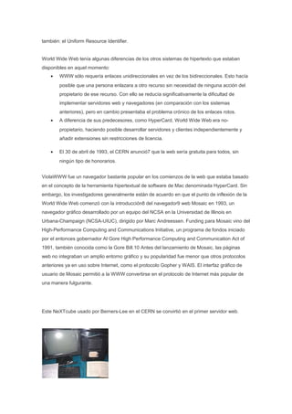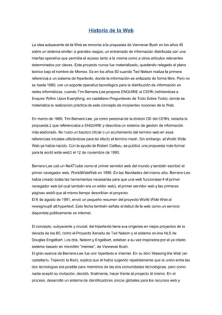 La historia de la Web comenzó con las ideas de Vannevar Bush en los años 40 sobre un sistema de hipertexto. Tim Berners-Lee propuso el World Wide Web en 1989 mientras trabajaba en el CERN, creando el primer navegador y servidor web. La introducción del navegador Mosaic en 1993 llevó a una rápida popularización de la Web. Berners-Lee sigue guiando el desarrollo de estándares web.