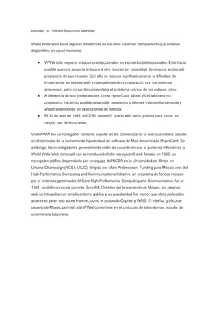 La historia de la Web comenzó con las ideas de Vannevar Bush en los años 40 sobre un sistema de hipertexto. Tim Berners-Lee propuso el World Wide Web en 1989 mientras trabajaba en el CERN, creando el primer navegador y servidor web. El lanzamiento del navegador Mosaic en 1993 llevó a la Web a una adopción masiva. Berners-Lee es considerado el inventor de la World Wide Web.