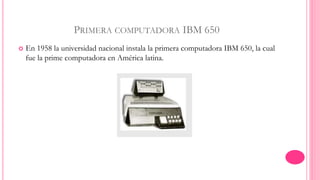 Este documento resume los hitos más importantes en el desarrollo de la tecnología de la información y la comunicación en México desde 1958 hasta 2003, incluyendo la instalación de la primera computadora IBM 650 en 1958, el desarrollo del primer videojuego en 1960, la conexión de México al sistema satelital en 1966, el origen de Internet a través de ARPANET en 1969, el surgimiento de la televisión por cable y los sistemas multiusuarios en los años 70, el desarrollo de la televisión vía satélite y las primeras computadoras