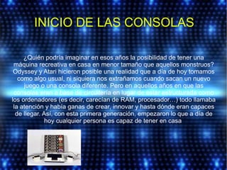 La primera consola fue la Magnavox Odyssey lanzada en 1972, mientras que Atari popularizó las consolas con su Atari Pong en 1975. Las consolas fueron evolucionando a lo largo de las generaciones, desde las primeras basadas en circuitos hasta las consolas de 16 y 64 bits como la Super Nintendo y la Nintendo 64. Las consolas actuales como la Xbox 360 y la PlayStation 2 ofrecen gráficos avanzados y funcionalidad multimedia.