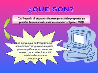 Los lenguajes de programación son herramientas que permiten la comunicación entre usuarios y computadoras, y se clasifican según su nivel de abstracción, ejecución y paradigma. Visual Basic, desarrollado por Microsoft en 1991, es un lenguaje de fácil aprendizaje que ha evolucionado desde su versión original, pero enfrenta limitaciones como dependencia de Windows y la falta de capacidad de exportar códigos a otras plataformas. A lo largo de la historia, más de 2,500 lenguajes han contribuido al desarrollo tecnológico contemporáneo.