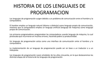 El documento resume las etapas históricas del desarrollo de los lenguajes de programación. Comenzó con lenguajes de máquina donde los programadores codificaban directamente las instrucciones binarias, lo que llevaba a muchos errores. Luego surgió el lenguaje ensamblador para representar de forma simbólica las instrucciones. En los años 1960 aparecieron los primeros lenguajes de alto nivel como FORTRAN para aumentar la productividad. Finalmente, en las últimas décadas han surgido lenguajes orientados a objetos como