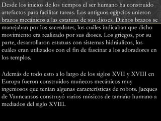 El documento describe brevemente cómo los seres humanos han construido artefactos mecánicos a lo largo de la historia, desde los antiguos egipcios y griegos hasta los muñecos mecánicos del siglo XVIII. Además, explica que los robots modernos tienen brazos formados por varios cuerpos articulados que les permiten orientar y situar elementos, a diferencia de los humanos.