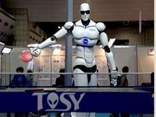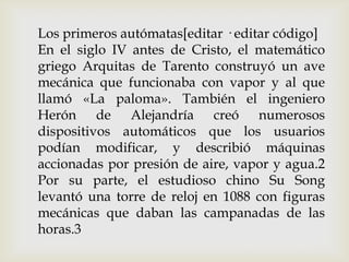 El documento describe la historia de los primeros autómatas y robots, desde las máquinas accionadas por vapor creadas por Arquitas de Tarento y Herón de Alejandría en el siglo IV a.C., hasta los autómatas musicales programables de Al-Jazari en 1206, y los juguetes mecánicos complejos creados por Hisashige Tanaka en la era Edo de Japón. Actualmente, los robots industriales y comerciales se utilizan ampliamente para realizar tareas de forma más exacta, barata o segura que los