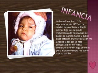 Esta persona nació en 1992 en Monterrey. Asistió a kínder, primaria y secundaria en esa ciudad, teniendo experiencias positivas y negativas como la separación de sus padres. Actualmente estudia mercadotecnia en la facultad, donde está aprendiendo y creciendo como persona para lograr sus metas a futuro. Valora mucho el apoyo de sus padres y amigos a lo largo de su vida.