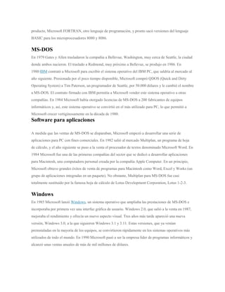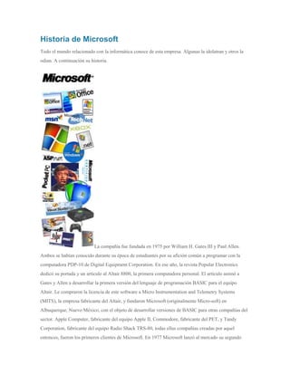 Microsoft fue fundada en 1975 por Bill Gates y Paul Allen para desarrollar software BASIC para la primera computadora personal. Microsoft tuvo éxito vendiendo su sistema operativo MS-DOS a IBM y otros fabricantes de computadoras, lo que llevó a su rápido crecimiento. Microsoft continuó dominando el mercado de sistemas operativos para PC con versiones posteriores de Windows. Sin embargo, la compañía se enfrentó a demandas antimonopolio por sus prácticas comerciales.