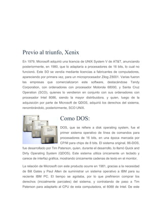Windows evolucionó desde 1981 cuando Microsoft adquirió el sistema operativo QDOS, el cual se convirtió en MS-DOS y luego en Windows 1.0 en 1985. Windows pasó por varias versiones mejoradas a través de los años, agregando funciones como ventanas superpuestas, soporte para mouse y gráficos de mayor calidad. Mientras tanto, Microsoft también desarrolló Windows NT, la primera versión de Windows en ser de 32 bits y no depender de MS-DOS.