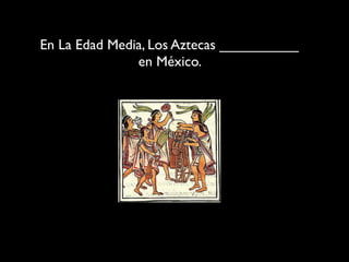 Los Aztecas vivieron en México durante la Edad Media. Le pidieron a su dios permiso para construir una gran ciudad-imperio. Su dios les indicó que construyeran la ciudad donde vieran a un águila comiendo una serpiente sobre un cactus. Después de 200 años de búsqueda, los Aztecas encontraron la señal y fundaron la ciudad de México en 1325. Construyeron un sistema de canales e islas que hizo su ciudad muy fértil y poderosa.
