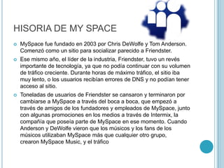 MySpace fue fundado en 2003 por Chris DeWolfe y Tom Anderson como un sitio para socializar similar a Friendster. Ganó popularidad rápidamente cuando Friendster experimentó problemas técnicos que hicieron que el sitio fuera lento. Los usuarios insatisfechos de Friendster se cambiaron a MySpace, donde podían crear perfiles personalizados con fotos, música y detalles sobre sus intereses y estilo de vida. MySpace también permitió que artistas musicales promocionaran su música, lo que atrajo a más usuarios y contribuyó al rápido crecimiento del sitio