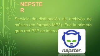 Napster fue el primer servicio P2P de intercambio de archivos de música en formato MP3 lanzado en 1999. Fue demandado en 2000 por Metallica y otras compañías discográficas por violaciones de derechos de autor al permitir que usuarios compartieran canciones sin permiso. Años más tarde, Telefónica y Vodafone España llegaron a acuerdos con Napster para ofrecer servicios de música en streaming a través de sus plataformas.