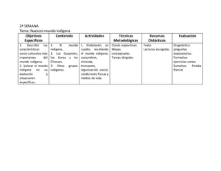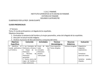 Este documento presenta el plan de estudios para el curso de Historia de Panamá impartido en el Instituto Superior de Alta Cocina de Panamá. El curso se divide en 12 semanas con diferentes temas cada una. Cada semana incluye objetivos generales y específicos, contenidos, actividades metodológicas, recursos didácticos y métodos de evaluación. Los temas incluyen el mundo prehispánico, el mundo indígena, la sociedad colonial, la independencia de Panamá y la unión a Colombia. El curso analiza la