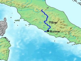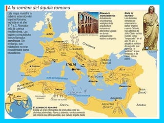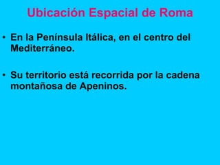 Roma se ubicó en la península itálica, limitada por los Alpes, el mar Tirreno, el mar Adriático y el Mediterráneo. Pasó por una monarquía, república e imperio. Bajo la república hubo luchas entre patricios y plebeyos que terminaron con la igualdad legal y política de estos últimos. Roma luego se expandió a través de las guerras púnicas, conquistando territorios en el Mediterráneo. La república cayó en crisis por la corrupción y las l